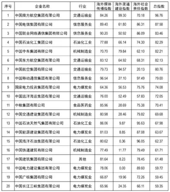 《報(bào)告》數(shù)據(jù)顯示,中國南方航空集團(tuán)有限公司、中國電信集團(tuán)有限公司、中國聯(lián)合網(wǎng)絡(luò)通信集團(tuán)有限公司、中國石油化工集團(tuán)公司、中國中車集團(tuán)有限公司位居前5位。其中,航空、信息服務(wù)業(yè)表現(xiàn)突出,各項(xiàng)指數(shù)發(fā)展均衡,中國南方航空集團(tuán)有限公司位列榜單首位。與2017年相比,中國電信集團(tuán)有限公司由于海外媒體傳播指數(shù)與社會(huì)責(zé)任指數(shù)表現(xiàn)較為突出,使其整體排名有大幅提升。(見表1)