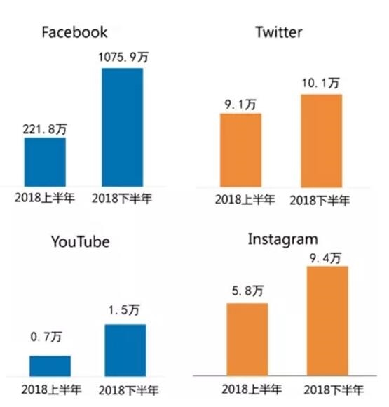 2018年以來,尤其是6月份以后,央企及其子公司新開通了幾十個(gè)境外社交媒體賬號(hào)。受此影響,與2018年上半年相比,F(xiàn)acebook平臺(tái)中央企業(yè)集團(tuán)賬號(hào)的總粉絲量增長(zhǎng)最迅猛,增長(zhǎng)率高達(dá)385.2%,增長(zhǎng)量為850余萬。其次,YouTube平臺(tái)央企集團(tuán)賬號(hào)的總粉絲量增長(zhǎng)率也非常可觀,為101.2%,增長(zhǎng)量為7523個(gè);與上半年相比,Instagram平臺(tái)央企集團(tuán)賬號(hào)的粉絲量增長(zhǎng)62.0%,增長(zhǎng)了3.6余萬;Twitter平臺(tái)央企集團(tuán)賬號(hào)總粉絲量增長(zhǎng)率為10.7%,粉絲量比上半年增長(zhǎng)近萬個(gè)。(見圖4)