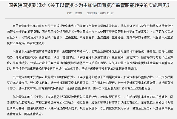 2019年11月7日,為貫徹落實黨的十九屆四中全會關(guān)于形成以管資本為主的國有資產(chǎn)監(jiān)管體制的決策部署,按照黨中央、國務(wù)院關(guān)于深化國資國企改革的有關(guān)要求,國資委印發(fā)《關(guān)于以管資本為主加快國有資產(chǎn)監(jiān)管職能轉(zhuǎn)變的實施意見》(簡稱《實施意見》)。11月27日,國務(wù)院國資委在京召開政策吹風(fēng)會時表示,《實施意見》是國資監(jiān)管機(jī)構(gòu)第一次以文件的形式,明確管資本的具體路徑。國資委將以此次職能轉(zhuǎn)變?yōu)樾缕瘘c,按照《實施意見》明確的方向和路徑,全面落實各項措施,著力完善以管資本為主的國有資產(chǎn)監(jiān)管體制,不斷提高監(jiān)管的系統(tǒng)性針對性有效性,確保管資本重點任務(wù)落實落地。