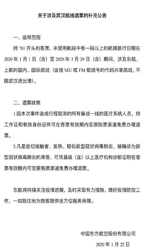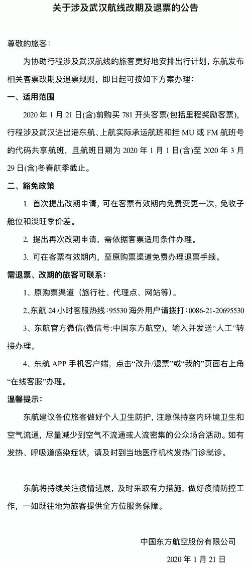 凡在2020年1月31日(含)前購買,旅行日期為2020年1月1日(含)至2020年3月29日(含),涉及武漢的南航實際承運航班(含經停)及掛CZ航班號的代碼共享航班的784客票。
