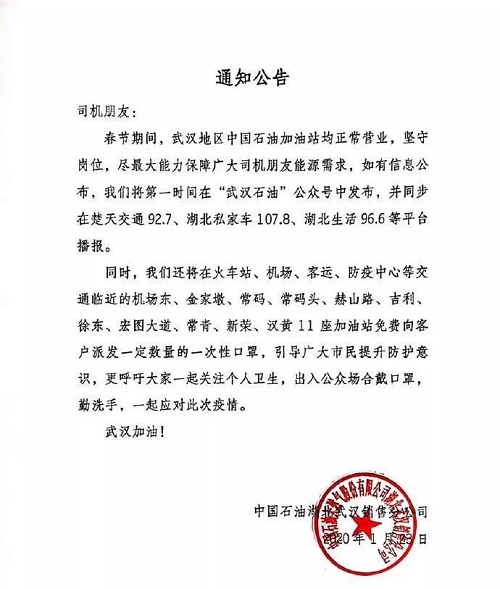 春節期間,武漢地區中國石油加油站均正常營業。此外,在機場東、金家墩、常碼、常碼頭、赫山路、吉利、徐東、宏圖大道、常青、新榮、漢黃11座中國石油加油站免費派發一次性口罩。