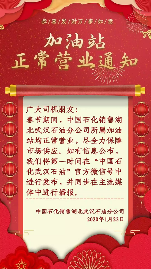 1月23日,中國石化表示,春節期間中國石化銷售湖北武漢石油分公司所屬加油站均正常營業,盡全力保障市場供應。網傳“斷油”消息不實,市民不必恐慌,不必提前集中到加油站加油。