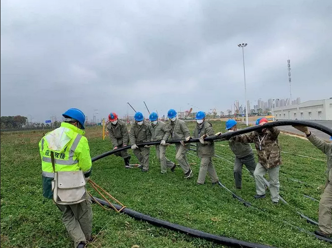 國網武漢供電公司員工在江夏區雷神山醫院電力配套工程現場施工。