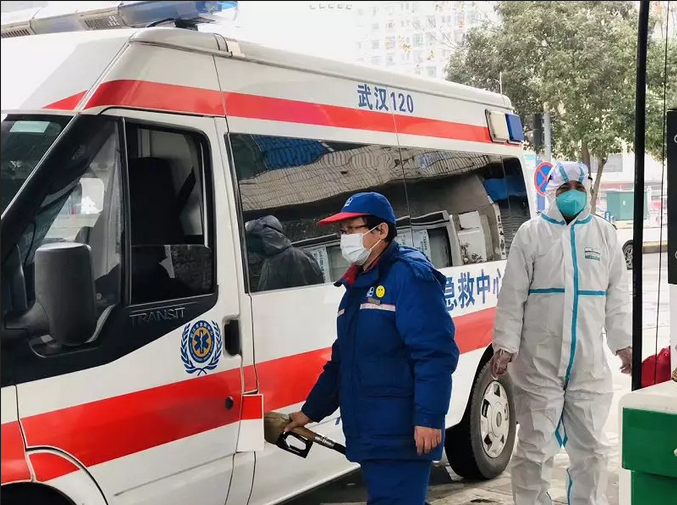 中國石化湖北武漢石油菱角湖加油站員工為救護車輛加油。