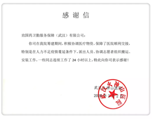 武漢火神山醫院亦對于國藥衛勤志愿者團隊表達了感謝!