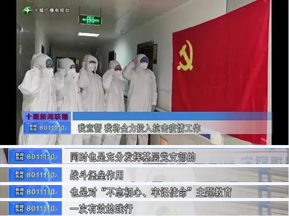 1月30日,國藥東風總醫院黨委決定,成立新型冠狀病毒感染的肺炎防治一線臨時黨支部,任命感染科主任姜雪強擔任支部書記,感染科護士長何霞擔任副書記。當天14:00,臨時黨支部召集5名在崗黨員面向黨旗莊嚴宣誓:“我將全力投入抗擊疫情工作,不計報酬,不畏生死,發揮黨員示范作用,沖鋒在前,為保障人民健康,為奪取最終勝利,貢獻力量!”