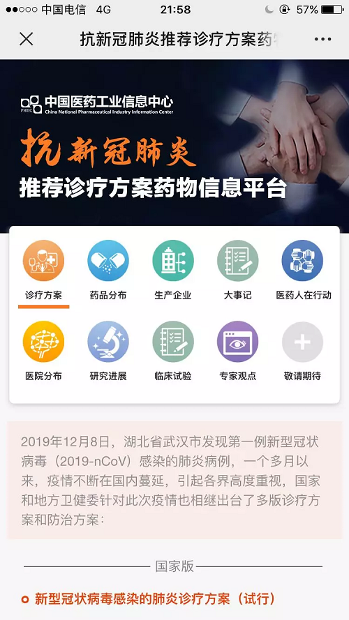 及時上線“抗新冠肺炎推薦診療方案藥物信息平臺”。國藥醫工總院下屬企業中國醫藥工業信息中心放棄春節休假、積極組織人員加班加點協助工信部消費品工業司和多省工信廳查詢各類醫用物資相關信息,并緊急聯系多家醫藥企業,為國家應急供應保障提供支持。同時他們還用急行軍速度,于1月底緊急上線“抗新冠肺炎推薦診療方案藥物信息平臺”,該平臺共分診療方案、藥品分布、生產企業、醫藥人在行動、醫院分布、研究進展、大事記和專家觀點等版塊。特別是藥品分布和生產企業板塊,充分利用了中國醫藥工業信息中心醫藥行業大數據平臺的優勢,匯總了診療方案推薦的所有品種在全國的區域分布、商品名、企業、劑型、規格和批準文號等信息,將為各地查詢抗新冠肺炎藥品來源提供數據支持。
