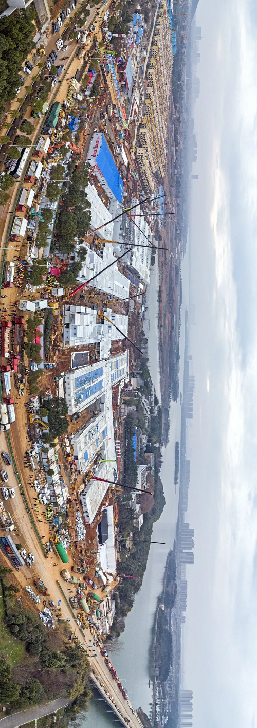 凌晨1點,中建三局迅速成立應急工程建設現場指揮部,明確組織架構和責任人。現場施工主要分為三個階段進行,首先是場平和硬化,然后進行上部結構施工,最后是機電設施安裝。