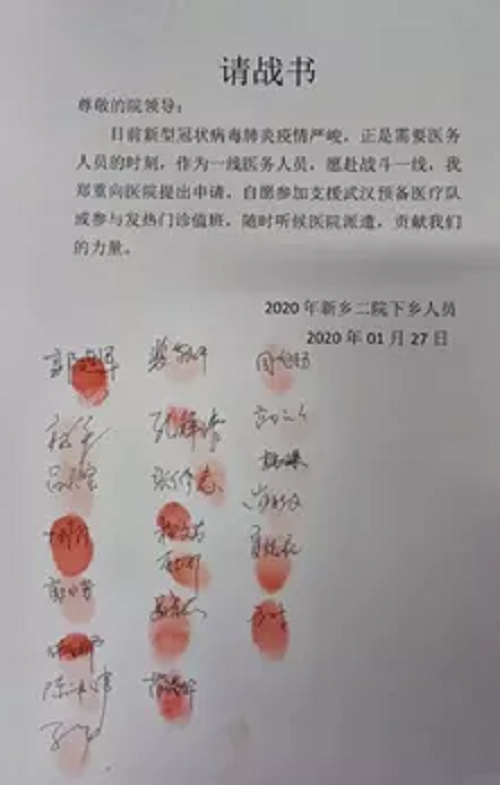 面對(duì)疫情,花果醫(yī)院發(fā)布了《堅(jiān)決打贏防控新型冠狀病毒肺炎疫情倡議書》,醫(yī)院廣大醫(yī)護(hù)人員積極響應(yīng),主動(dòng)請(qǐng)戰(zhàn),不一會(huì)兒,請(qǐng)戰(zhàn)書便刷滿了整個(gè)屏幕。