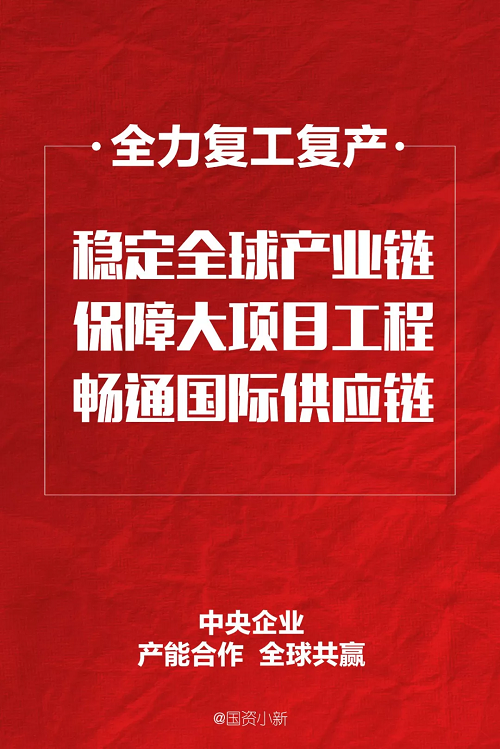 國務院國資委黨委深入學習貫徹習近平總書記重要指示批示精神,堅決貫徹落實黨中央、國務院決策部署,落實中央應對新型冠狀病毒感染肺炎疫情工作領導小組要求,指導中央企業一手抓疫情防控,一手抓復工復產,全力以赴保持生產經營穩定運行,努力為打贏疫情防控阻擊戰作出國資央企積極貢獻。有關中央企業全力推進復工復產,穩定外需,加強國際產能合作,加快海外重點工程建設,促進全球產業鏈穩定、供應鏈暢通。