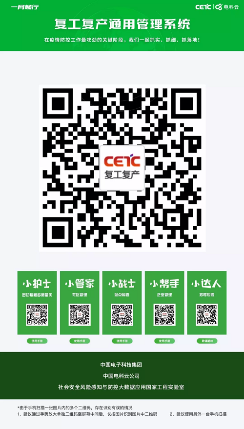 2月20日,中國電科正式發布“一網暢行——復工復產通用管理系統”,并面向公眾開放使用。該系統由一個風險人群感知大數據中心、一個智能指揮平臺、五個APP應用組成(1+1+5),具有數據權威、精準評估、體系聯動、有效管控四大特點。各級政府及企事業單位可通過互聯網掃碼下載,既可單獨使用,又可組合成管理體系,進而實現精確管控。