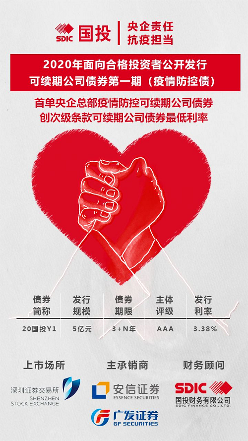 2020年2月18日,國家開發投資集團有限公司于深交所成功發行國內資本市場首單央企總部疫情防控可續期公司債券,發行規模5億元,發行利率3.38%,期限3+N年,募集資金將優先用于支持防疫相關成員企業開展防疫物資生產活動。