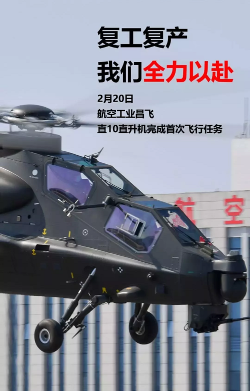 2月20日,航空工業昌飛完成復工復產后5架武裝直升機的第一飛。