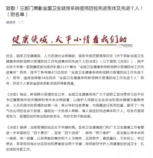 今日,國(guó)家衛(wèi)生健康委、人力資源社會(huì)保障部、國(guó)家中醫(yī)藥管理局印發(fā)《關(guān)于表彰全國(guó)衛(wèi)生健康系統(tǒng)新冠肺炎疫情防控工作先進(jìn)集體和先進(jìn)個(gè)人的決定》。