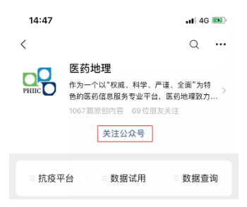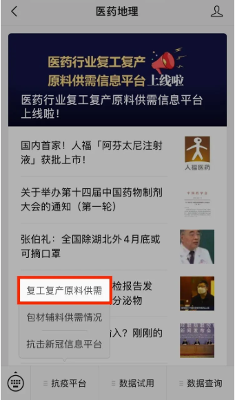 2)掃碼或搜索關(guān)注“醫(yī)藥地理”公眾號,點擊公眾號下方菜單欄「抗疫平臺」中的「復(fù)工復(fù)產(chǎn)原料供需」進(jìn)入。