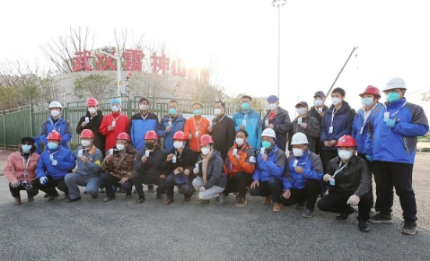 2月20日,被授予“雷神山醫(yī)院榮譽(yù)員工”的中建三局、中南建筑設(shè)計院等參建單位員工在雷神山醫(yī)院前合影留念。