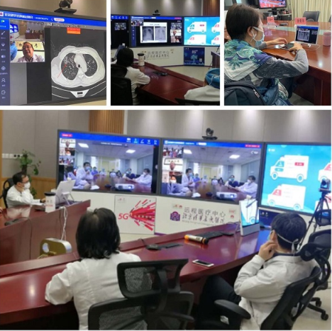 2月25日,在中國聯(lián)通5G網(wǎng)絡(luò)和醫(yī)療云平臺支撐下,橫跨武漢、北京和舟山三地共六個會場的新冠肺炎CT遠(yuǎn)程會診順利舉行。