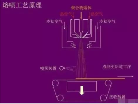 顧名思義,熔噴布是“噴”出來(lái)的。采用高速熱空氣流對(duì)模頭噴絲孔擠出的聚合物熔體細(xì)流進(jìn)行牽伸,由此形成超細(xì)纖維并收集在凝網(wǎng)簾或滾筒上,同時(shí)自身粘合而成。