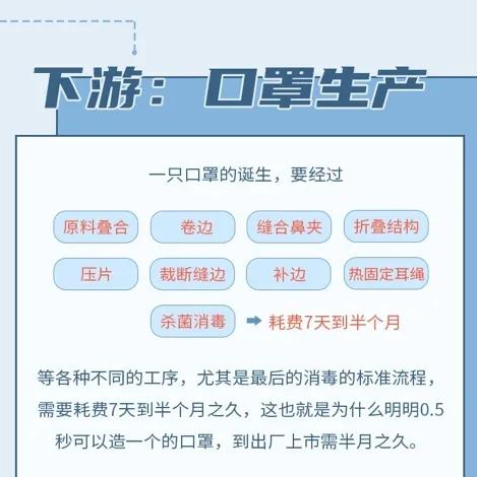 尤其是最后的消毒標(biāo)準(zhǔn)流程,需要耗費(fèi)7天到半個(gè)月之久,這也是為什么明明0.5秒可以造一只口罩,到真正上市買賣的時(shí)間大家都覺得很久。