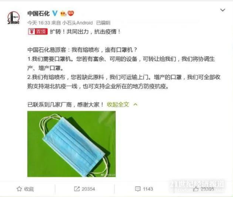 2月6日下午16時(shí)33分,中國(guó)石化發(fā)出“英雄帖”《我有熔噴布,誰(shuí)有口罩機(jī)》。2月7日中午,中國(guó)石化就與合作伙伴對(duì)接完成11條口罩生產(chǎn)線。3月3日起,中國(guó)石化在北京50座加油站開始銷售的“納通”牌口罩,就是與民營(yíng)企業(yè)北京納通科技集團(tuán)有限公司合作生產(chǎn)的。中國(guó)石化提供原料的協(xié)作企業(yè)口罩日產(chǎn)量達(dá)到105萬(wàn)只。