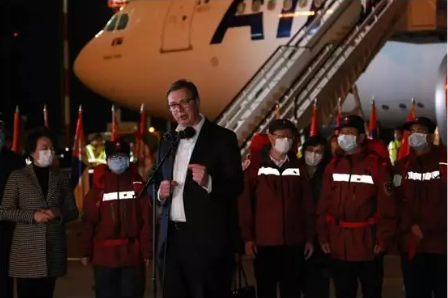 當地時間3月21日晚,塞爾維亞貝爾格萊德尼古拉·特斯拉機場燈火通明,塞爾維亞總統武契奇率領豪華接機陣容,同中國駐塞大使陳波一起,迎接中國政府萬里馳援鐵桿朋友的醫療隊和防疫物資。