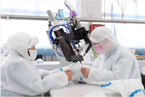 目前,中央企業啟動的27個研制型號已成功進入量產,截至目前,6家中央企業已累計排產壓條機1014臺,口罩機755臺,這些設備能夠支撐形成每日約12萬件醫用防護服和近7000萬只口罩的產能。