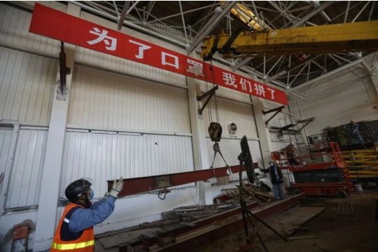 為加速攻關(guān),國資委積極協(xié)調(diào)國內(nèi)口罩機、壓條機企業(yè)聚集地的廣東省國資委,幫助對接相關(guān)技術(shù)資源,協(xié)助攻關(guān)企業(yè)快速起步。同時,國資委對各中央企業(yè)進度實行每日跟蹤、每日通報,在組織研制過程中引入賽跑機制,營造“比學趕幫超”氛圍。國機集團僅用9天時間就完成從無技術(shù)無圖紙到批量生產(chǎn)壓條機的全過程。