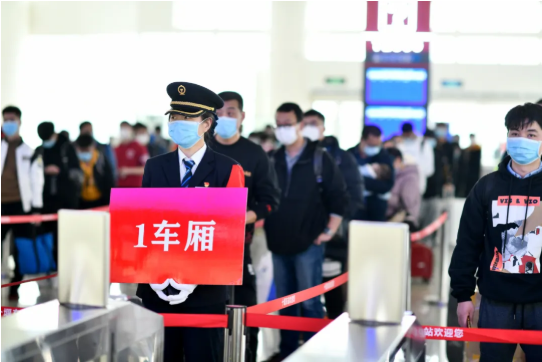 在出發(fā)現(xiàn)場,安檢、進出站、驗票、候車等環(huán)節(jié)都為復工人員開辟了綠色通道,旅客保持一定距離,避免人員聚集;進站前所有人員需展示健康碼并測量體溫;全體乘客均使用“團體旅客證”車票。