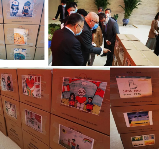 物資外箱上一幅幅充滿童趣的圖畫,均由國藥國際和三峽集團員工子女們手繪而成,飽含著孩子們對支持秘魯人民抗擊疫情純真而暖心的表達,和每一位參與物資籌備人的由衷關切。