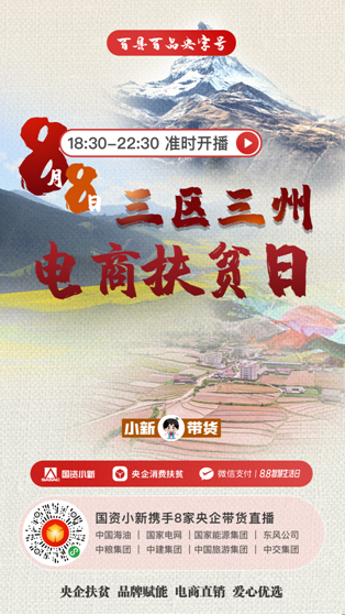 8月8日18:30至22:30,中國交建黨委常委、副總裁裴岷山,中國海油扶貧辦主任宋瑞林,國家電網扶貧辦主任張蓮瑛,國家能源集團戰略規劃部主任魏慎洪,東風公司扶貧辦副主任劉鵬,中糧可口可樂飲料有限公司黨委書記、CEO慶立軍,中建集團中建二局紀委書記鄧小林,中國旅游集團旅游服務有限公司董事、紀委書記胡志敏將走進“百縣百品央字號——‘三區三州’電商扶貧日”微信小程序直播間,帶來“三區三州”特產好物,講述中央企業定點扶貧的動人故事。