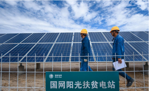 國網青海電力工作人員在國家電網捐贈的瑪多10兆瓦易地扶貧光伏電站內巡視設備