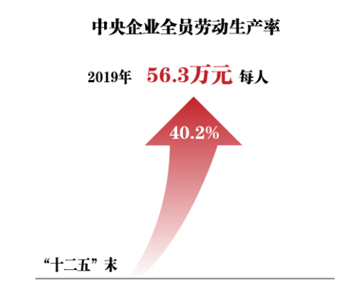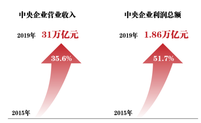效益提升、布局優(yōu)化——2019年中央企業(yè)實(shí)現(xiàn)營(yíng)業(yè)收入31萬億元、利潤(rùn)總額1.86萬億元,分別比2015年增長(zhǎng)35.6%和51.7%;2019年中央企業(yè)全員勞動(dòng)生產(chǎn)率為每人56.3萬元,比“十二五”末增長(zhǎng)40.2%。國有資本進(jìn)一步向重要行業(yè)和關(guān)鍵領(lǐng)域集中。