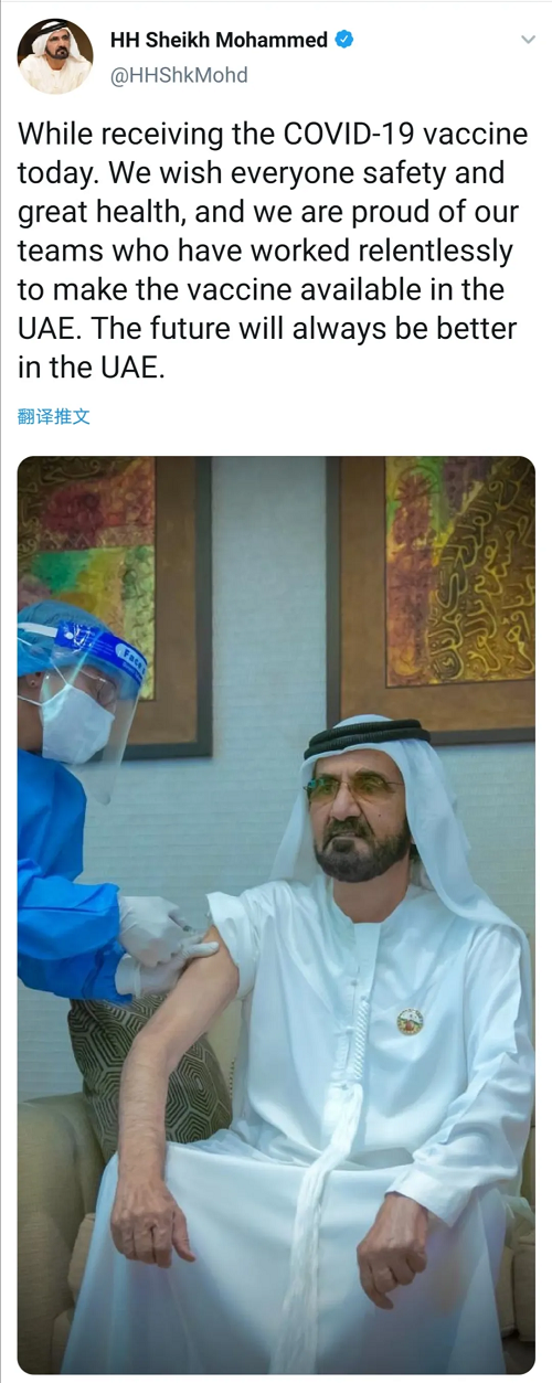 11月3日,阿拉伯聯合酋長國副總統兼總理、迪拜酋長阿勒馬克圖姆在社交媒體分享了自己正在接種國藥集團中國生物新冠疫苗的照片,并表示:“在我接種疫苗時我希望所有人安全、健康。我們非常感謝我們的團隊,正是他們沒日沒夜地工作使得阿聯酋得以接種新冠疫苗。阿聯酋的未來更美好。”