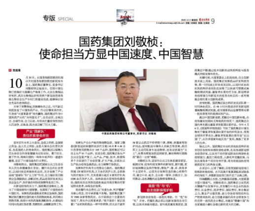 2020年12月3日,《醫(yī)藥經(jīng)濟(jì)報(bào)》專版刊發(fā)國藥集團(tuán)劉敬楨董事長專訪文章《國藥集團(tuán)劉敬楨:使命擔(dān)當(dāng)方顯中國速度、中國智慧》。