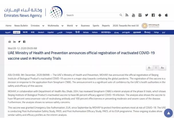 ▲阿聯酋通訊社報道國藥集團中國生物新冠滅活疫苗在阿聯酋注冊上市