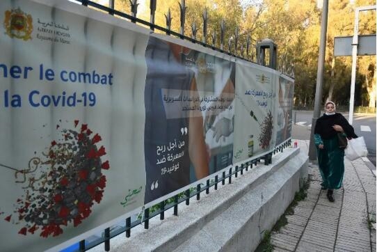 2020年12月15日,一名女士走過摩洛哥拉巴特街頭一處關于新冠疫苗的宣傳海報。(新華社發(fā))