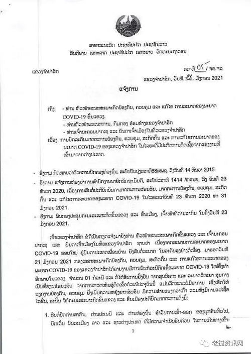 由于新冠肺炎疫情的新一輪爆發,到2021年1月21日占巴塞省省內發現新冠肺炎感染病例1例,觀察感染患者沒有明顯感染征兆,需加強防控工作,因此占巴塞省2021年1月26日發出第5號通知,在勞工入境期間加強新冠肺炎疫情的預防管控隔離解決措施。省縣特別委員主要采取以下措施: