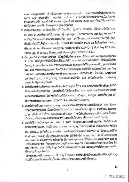 繼續關閉國際關口、 當地出入境檢查站,老撾公民和獲得特別委員會許可急需出入的外國人除外。國際關口的物運輸,可以正常進出,但必須按照占巴塞省省長的第04號的附加通知完成。