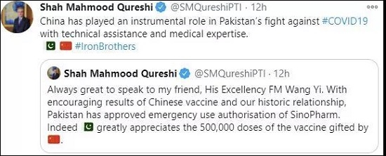 1月21日,國務委員兼外長王毅應約同巴基斯坦外長庫雷希通電話。王毅表示,中國政府已決定向巴方提供疫苗援助,并積極協調中國企業加快向巴方出口疫苗。庫雷希代表巴政府和人民感謝中國政府決定向巴方提供疫苗援助并提供采購便利。庫雷希表示,巴方已批準中國國藥集團疫苗緊急使用授權,將積極考慮批準其他中國疫苗市場準入。同一天,庫雷希在社交媒體上宣布,中國將向巴基斯坦贈送50萬劑新冠疫苗,他們對此表示“非常感激”。