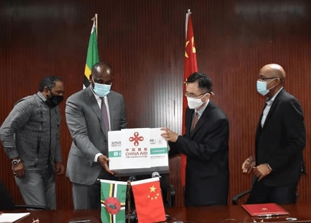 斯凱里特和羅松濤交接疫苗(圖片由駐多米尼克使館提供)