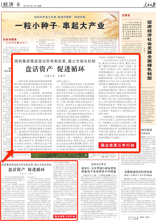 小小疫苗,大國重器。新冠病毒滅活疫苗的上市,是中國醫藥集團有限公司實施現代國有企業制度改革成果的一個縮影。2020年,國藥集團全年實現營業收入突破5000億元,利潤總額突破200億元,位列世界500強企業榜單第145位,連續第七年被國資委評為“中央企業負責人經營業績考核A級企業”。