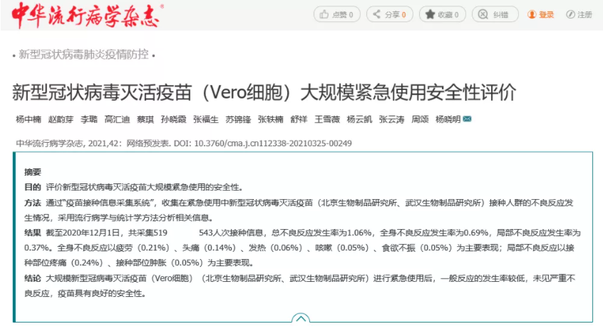 4月21日,中國核心學術期刊《中華流行病學雜志》刊登了題為“新型冠狀病毒滅活疫苗(Vero細胞)大規模緊急使用安全性評價”的論文,發布基于國藥集團中國生物北京制品研究所、武漢生物制品研究所新型冠狀病毒滅活疫苗大規模緊急使用安全性評價。