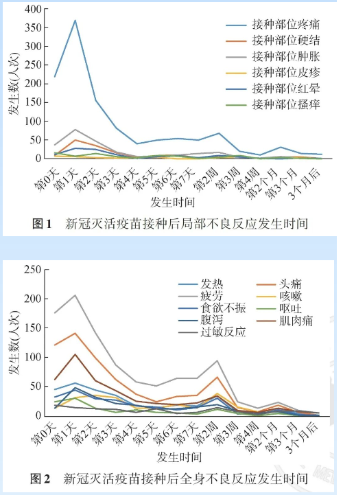 根據“疫苗接種信息采集系統”收集信息統計,局部反應中接種部位疼痛主要發生在接種當天及接種后24小時內;接種部位硬結主要發生在接種后的1~4天內;接種部位腫脹、紅暈、瘙癢及皮疹主要發生在接種后1周內。全身反應中接種后疲勞主要發生在接種當日及接種后的2天內;接種后頭痛主要發生在0~3天內;肌肉痛主要發生在接種后0~3天內,以第1天發生最多;發熱、咳嗽、食欲不振、腹瀉及過敏主要發生在接種后的1周內。