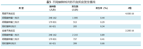 接種劑次差異上,第一劑次不良反應發生率高于第二劑次,同時2劑次的不良反應低于第一針。