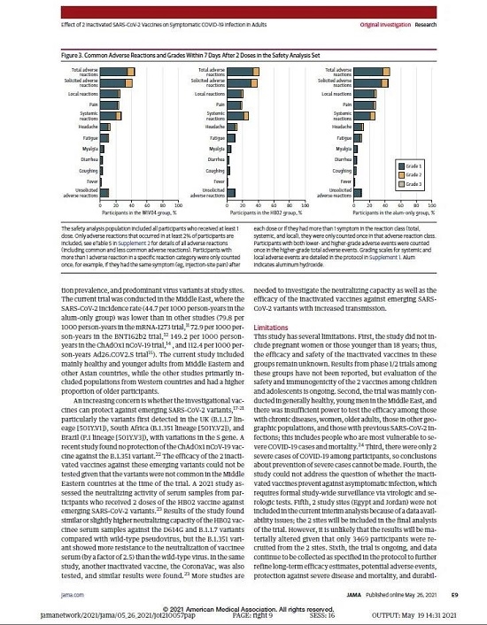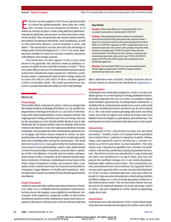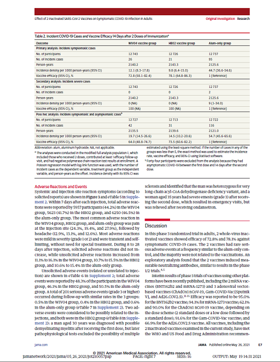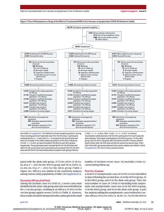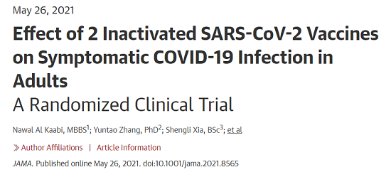 5月26日,國際醫學期刊《美國醫學會雜志》(TheJournaloftheAmericanMedicalAssociation,JAMA,IF45.54)刊登了國藥集團中國生物發表的《兩種新型冠狀病毒滅活疫苗對成人COVID-19感染的保護效力評價》(“Effectof2InactivatedSARS-CoV-2VaccinesonSymptomaticCOVID-19InfectioninAdults”)。報告依據中國生物新冠滅活疫苗Ⅲ期臨床試驗結果,總結分析了中國生物所屬北京生物制品研究所(BIBP)、武漢生物制品研究所(WIBP)新冠滅活疫苗的有效性、安全性等Ⅲ期臨床試驗結果。