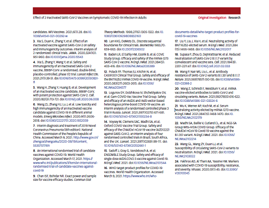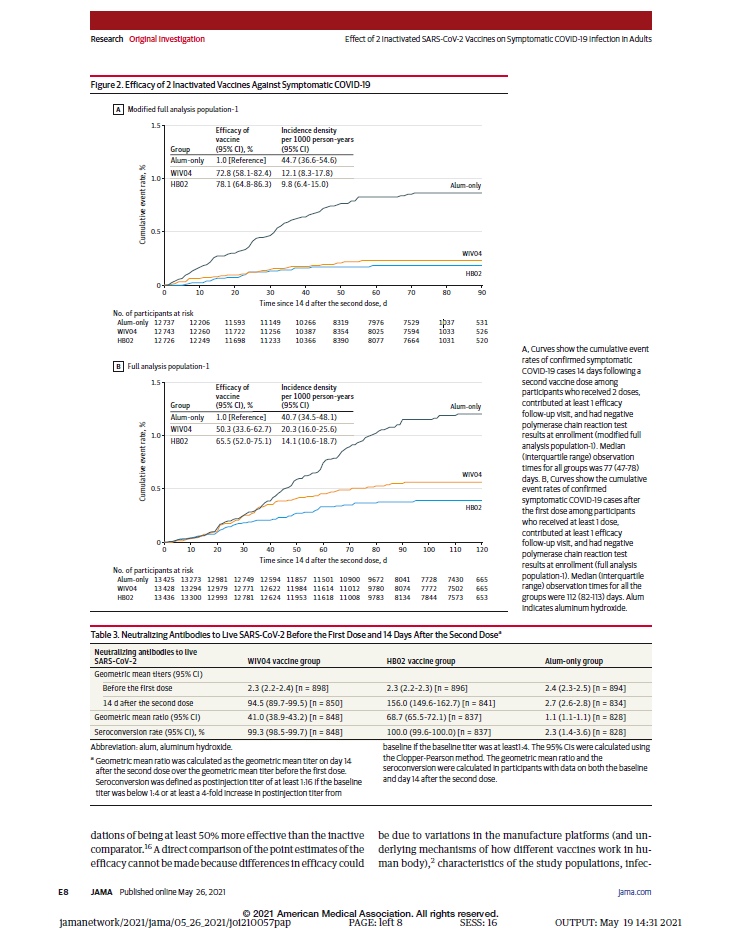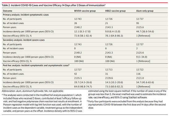 本項研究結果針對中國生物兩款新冠滅活疫苗隨機、雙盲、安慰劑對照的Ⅲ期臨床試驗開展的中期分析。自2020年7月16日起,40411名受試者入組并隨機分為三組,分別為鋁佐劑組、新冠疫苗WIV04組和新冠疫苗HB02組。受試者在第0天和第21天接受兩次肌肉注射。自第二劑接種后14天,累計確診142例有效病例(鋁佐劑組95例,WIV04組26例,HB02組21例),兩種疫苗組有效率分別為72.8%和78.1%(均P<.001)。鋁佐劑組出現2例重癥病例,兩個疫苗組均未出現重癥病例。接種后7天總不良反應發生率在鋁佐劑組為46.5%,WIV04組為44.2%,HB02組為41.7%。嚴重不良事件在三組無顯著性差異。在兩個疫苗組中血清陽轉率均高于99.0%(與基線相比中和抗體滴度至少增加4倍),而在鋁佐劑組中為2.3%。目前,該研究仍在進行中,長期保護性和安全性仍在評估中。