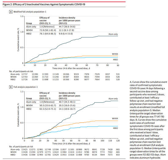 在首針注射35天之內(監測期外),共檢定出113例確診病例:鋁佐劑組43例,WIV04組43例,HB02組27例。結果顯示,WIV04疫苗接種首針后針對確診COVID-19病例的保護效力為50.3%(95%CI,33.6%-62.7%),HB02疫苗為65.5%(95%CI,52.0%-75.1%)。第21天(第二次注射日期)之前,鋁佐劑組與HB02組、WIV04組之間的發病率相似,第二劑接種后,與鋁佐劑組相比,疫苗組發病率顯著降低。