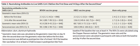 在免疫原性研究中,基線時中和抗體幾何平均滴度(GMTs)在兩個疫苗組均為2.3,鋁佐劑組為2.4,第二劑接種14天的GMTs在WIV04組中為94.5(95%CI,89.7-99.5),在HB02組中為156.0(95%CI,149.6-162.7),鋁佐劑組為2.7(95%CI,2.6-2.8)。WIV04組、HB02組和鋁佐劑組的血清陽轉率(4倍增長)分別為99.3%、100.0%和2.3%。