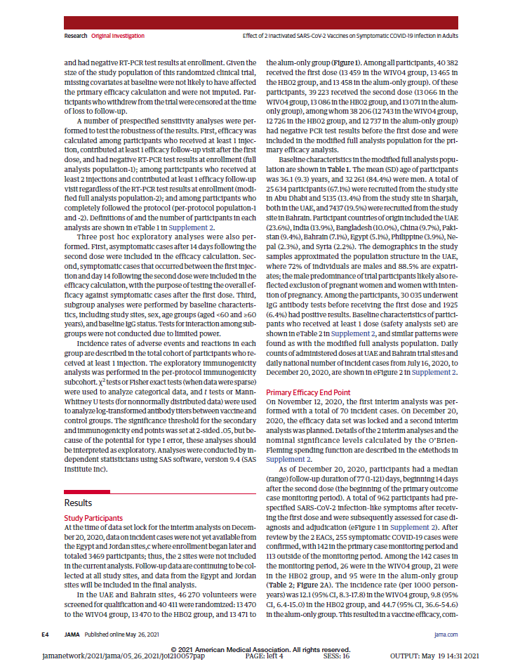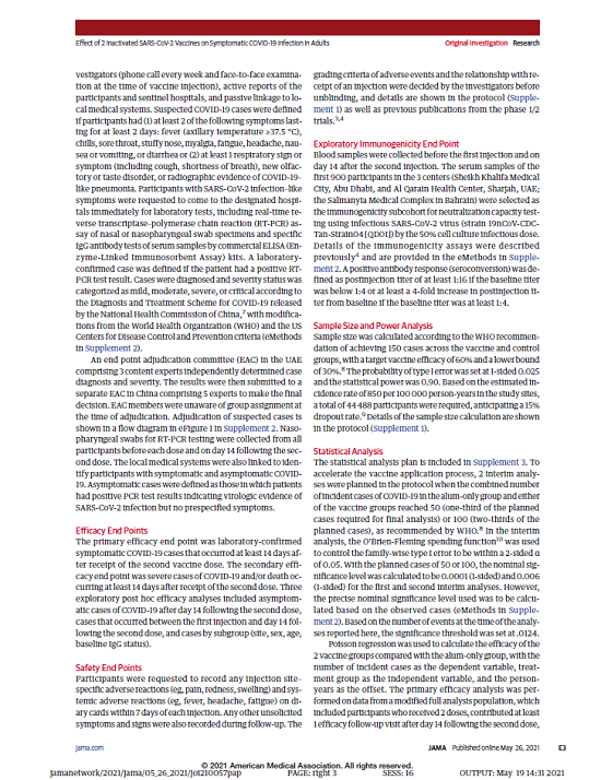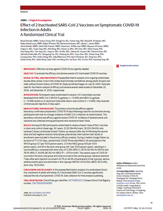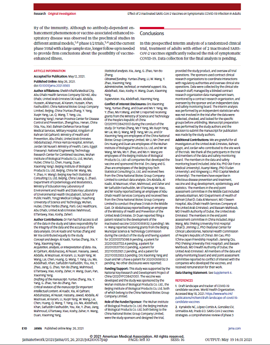 報告由國藥集團中國生物、國家聯合疫苗工程技術研究中心、武漢生物制品研究所、北京生物制品研究所、阿聯酋阿布扎比衛生服務公司(SEHA)謝赫·哈利法醫療城、巴林王國軍事醫院、阿聯酋衛生和預防部、約旦安曼哈姆扎王子醫院、埃及衛生部、河南省疾病預防控制中心、北京科特統計咨詢有限公司、華中科技大學、G42等多家機構和單位合作完成。報告于2021年3月17日提交至《JAMA》進行編審。