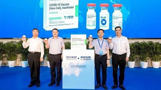 國藥集團董事長劉敬楨、副總經理董增賀,工信部消費品司副司長張曉峰、國務院國資委科創局副局長柳長森共同為剛剛下線的供應COVAX的中國新冠疫苗揭幕。中國生物黨委書記、副總裁朱京津發表了熱情洋溢的致辭。